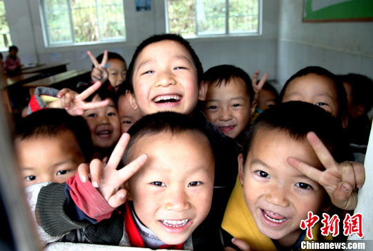 10月17日,贵州铜仁印江土家族苗族自治县杉树乡对马村的对马小学内,学前班的孩子兴奋地跑到窗口观望。中新社发 陈小愿 摄