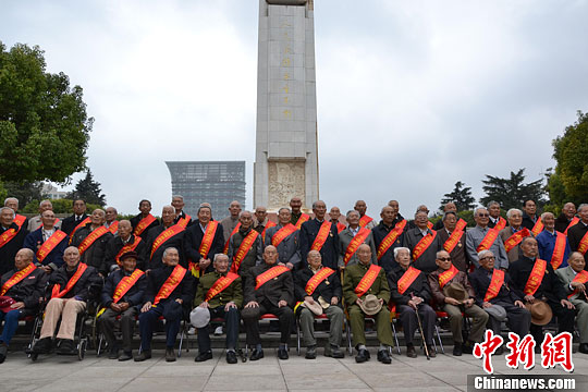 图为参加启动仪式的抗战老兵合影留念。中新社发 蒋卓成 摄