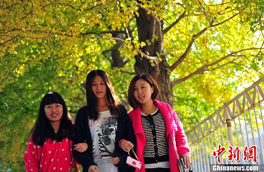 10月17日,学生走在沈阳的辽宁大学校园内“银杏街”上。这条著名的银杏街,每到秋天便吸引了众多的摄影爱好者前来拍摄。中新社发 于海洋 摄