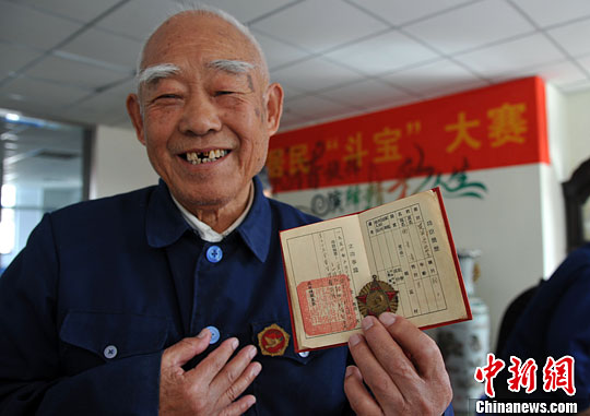 10月17日,一位老人晒出自己的军功章。中新社发 韩苏原 摄