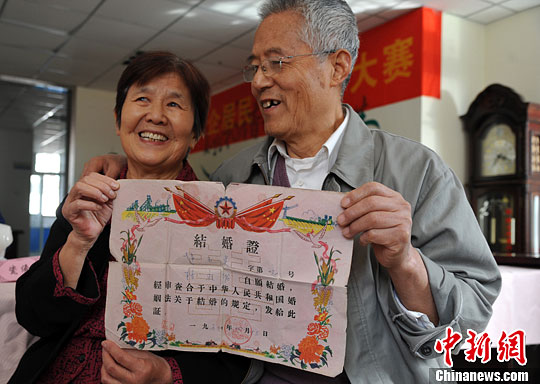10月17日,一对金婚夫妇晒出自己珍贵的上世纪60年代结婚证书。中新社发 韩苏原 摄