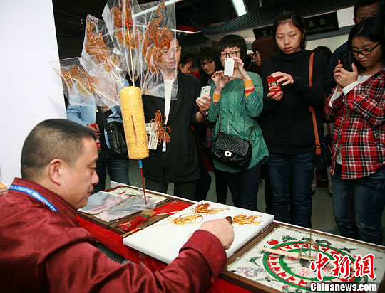 10月17日,2013杭州文博会在滨江白马湖生态创意城国际会展中心开幕,画糖师傅的精湛技术引得游人驻足观赏。中新社发 李晨韵 摄