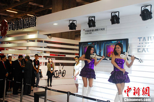 10月17日,台湾精品馆在第十八届澳门国际投资展览会(MIF)上开馆,首次亮相澳门。图为美女琴手助兴开馆式。中新社发 毕永光 摄