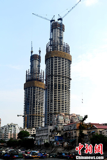 10月17日,在建中的厦门新地标——“双子塔”世贸海峡大厦,该建筑高达300米左右,建成后将成为厦门最高端的住宅和写字楼之一,也将成为厦门城市一道靓丽的风景线。中新社发 王东明 摄