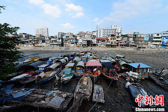 10月17日,渔船停在退潮后的避风坞——沙坡尾。中新社发 王东明 摄
