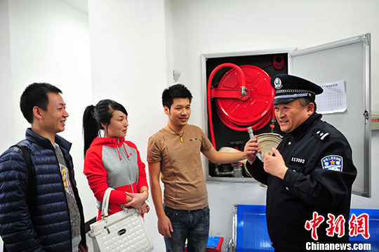 10月18日,沈阳沈河公安干警为业主讲解防火知识。中新社发 于海洋 摄