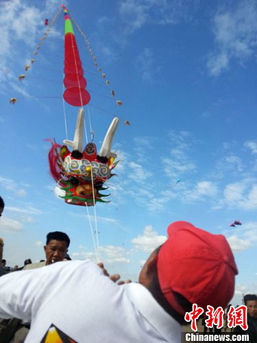 风筝制作专家袁卫平正吃力地控制着龙风筝。风筝重200多斤,共长68米,80节,控制起来非常困难。袁卫平的手上全是被风筝线弄出来的口子。但是相较于现在流行的双线风筝,袁卫平说,他还是喜欢传统的风筝。王琦 摄
