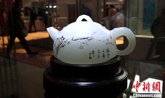 10月18日,哈尔滨国际珠宝玉石博览会在哈尔滨会展中心开幕,图为用和田白玉制作的《铁骨柔情》玉壶在博览会上展出,价值一百五十万。中新社发 胡迪 摄