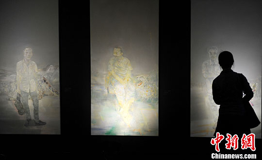 10月18日,由广州大剧院当代美术馆主办、泗海汇艺术基金承办的“绿现代隐喻——罗奇油画个展”在广州大剧院当代美术馆开幕。中新社发 梁永强 摄