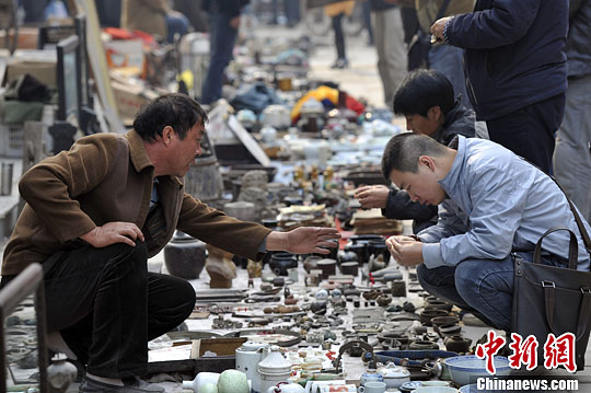 10月18日,中国大型的古玩市场——山西介休张兰古玩城开门迎客,收藏爱好者与商贩讨价还价。中新社发 韦亮 摄