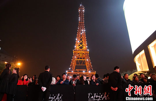 10月18日,北京市民站在埃菲尔铁塔雕塑前关注老佛爷百货开业。当日,位于北京西单商业街的法国“老佛爷”百货中国首家旗舰店正式营业。中新社发 熊然 摄