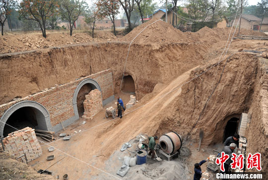 10月20日,河南三门峡市陕县曲村一处正在紧张修复和开发建设中的当地传统民居地坑院。中新社发 孙自法 摄