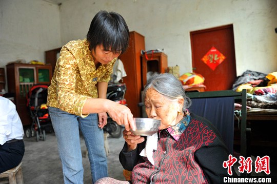 图好媳妇卢淑云在喂婆婆吃药。陈巍高 摄