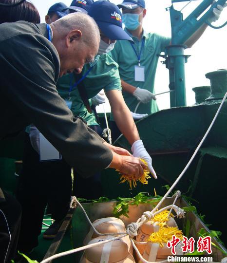 10月22日,来自广西各地的101户家庭将128例亲人骨灰撒向北海海域。图为一名老者在工作人员的帮助下将花瓣撒在骨灰坛上。翟李强 摄