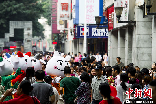 10月22日,广府文化旅游嘉年华吉祥物“广仔”来到广州北京路步行街,与市民们亲密互动。“2013广府文化旅游嘉年华”以“城市印记”为主题,活动期间设有骑楼模型展、岭南婚宴展示、吉祥物广仔巡游等展览活动。中新社发 龙宇阳 摄