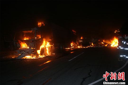 10月21日23时55分,G6高速公路内蒙古卓资山出口3辆货车连环追尾,并引起火灾。在过路司机的帮助下,事故车辆上的2名伤者获救。当地消防队员赶到现场后,于22日凌晨2时许将火全部扑灭。图为事故发生现场。中新社发 张文 摄
