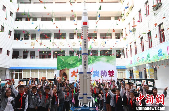 10月29日,南京火瓦巷小学的孩子们在该校师生们用环保材料亲手制作的火箭模型前欢呼。当日,南京举办小学生“大树下我的梦”主题活动,集中进行小学生综合素质教育才艺展示,同时现场放飞纸飞机,预示着孩子们的梦想会飞的更高更远。中新社发 泱波 摄