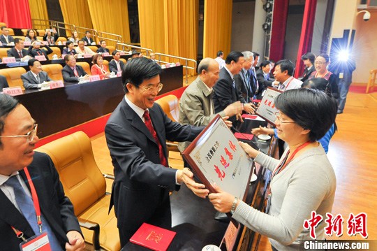 10月30日下午,第九次广西壮族自治区归侨侨眷代表大会在广西南宁闭幕,会议选举产生新一届侨联委员会委员,韦干连任广西侨联主席。图为中共广西区委组织部部长周新建(左)向广西侨联系统先进集体代表颁奖。中新社发 洪坚鹏 摄