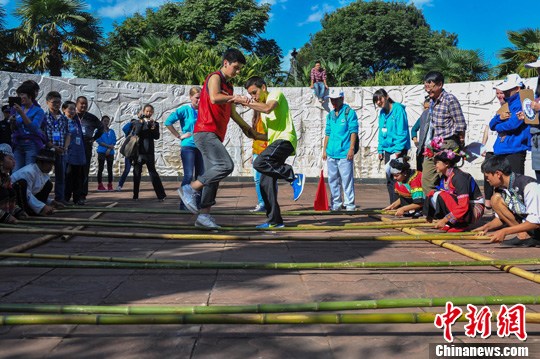 图为参赛选手进行“竹竿舞”比赛。中新社发 任东 摄