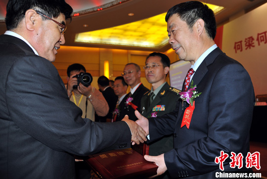 10月30日,香港何梁何利基金在北京举行2013年度颁奖典礼,中国科学院院士、中国科学技术大学教授潘建伟摘得本年度何梁何利最高奖——“科学与技术成就奖”,奖金100万港币。图为中国全国人大常委会副委员长陈昌智(右)向潘建伟院士颁奖。中新社发 孙自法 摄
