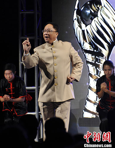 香港著名导演徐小明凭借《忽必烈传奇》夺得金天使最佳电视剧导演奖。图为上台领奖的徐小明现场演唱他曾导演的电视剧中插曲,并秀武功。中新社发 毛建军 摄