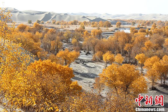 图为进入深秋,塔克拉玛干沙漠里的胡杨树,披上了金色的盛装。杨厚伟 摄
