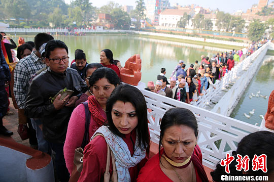 11月5日,尼泊尔民众在“王后池”排队祈福。中新社发 符永康 摄