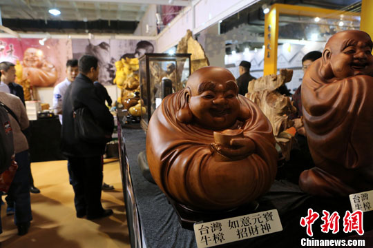 11月7日,北京文博会台湾文创精品展区内展出的牛樟木雕吸引了参观者。中新社发 李慧思 摄