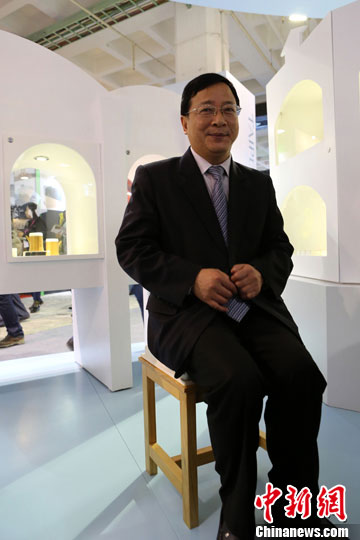 11月7日,国务院台办交流局局长程金中参观北京文博会内的台湾文创精品展区,并试坐创意设计品“豆腐凳”。中新社发 李慧思 摄