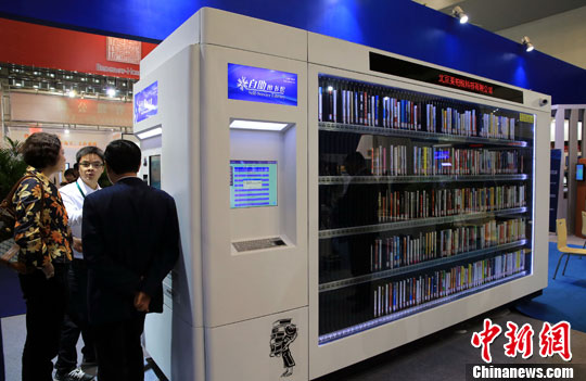 11月7日,2013年中国图书馆年会在上海浦东开幕,一款精巧的自助图书馆亮相展会。中新社发 潘索菲 摄