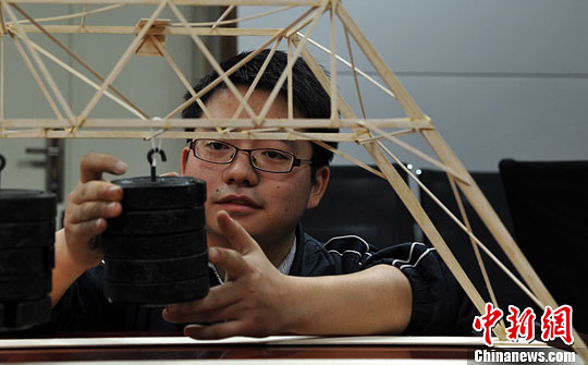 11月7日,安徽省合肥工业大学的学生展示空间大跨结构设计作品的承重能力,仅有46克的模型能承载20公斤的重量。中新社发 韩苏原 摄