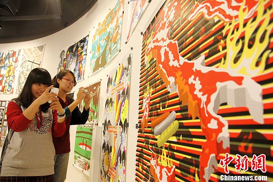 11月7日,一场名为“平面幸福-荷兰平面设计百年展”在上海举行。图为两位前来参观展览的设计系学生用手机拍下荷兰平面设计画作。中新社发 袁婧 摄
