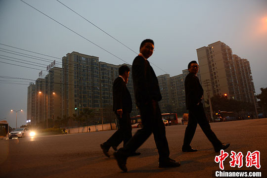 11月7日是中国的立冬节气,成都空气当日遭受中度污染,影响民众出行。图为几名“白领”男士在雾霾中穿行。中新社发 张浪 摄