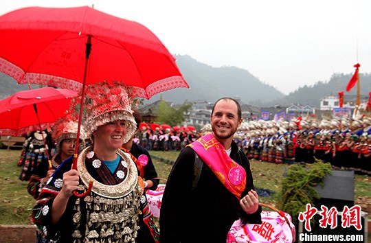图为美国夫妇情定西江千户苗寨。中新社发 严光辉 摄