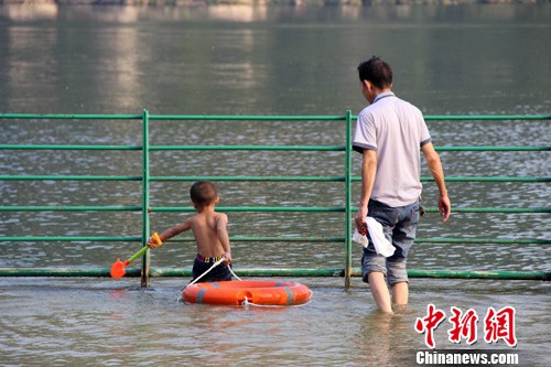 资料图:10月12日,一名家长带着小孩拖着救生圈准备下水玩耍。朱柳融 摄