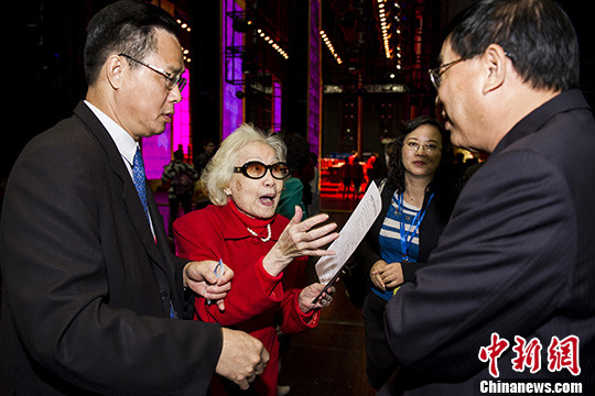 11月13日,著名粤剧表演艺术家“红线女”在世界广府人恳亲大会开幕式后与主办方交流。是日,首届世界广府人恳亲大会在广州开幕。中新社发 龙宇阳 摄