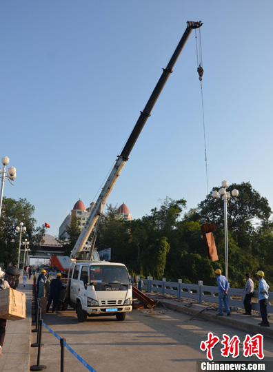 图为大型吊车对破拆下的部分船体进行转移。曾春 摄
