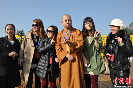 图为延参法师“卖萌”比出V字手势与粉丝合照。陈丹妮 摄