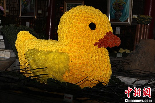 11月17日,一年一度的台北士林官邸菊展登场,由千朵黄菊组合成的“小黄鸭”,模样可爱吸睛,成为最大焦点。中新社发 董会峰 摄
