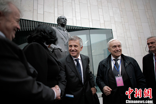 图为4月21日开馆当日,小萨马兰奇在纪念馆外父亲的铜像前与宾客握手。中新社发 佟郁 摄