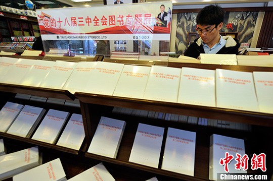11月18日,在山西太原书城,民众阅读刚刚上架的《中国共产党第十八届中央委员会第三次全体会议公报》。中新社发 韦亮 摄