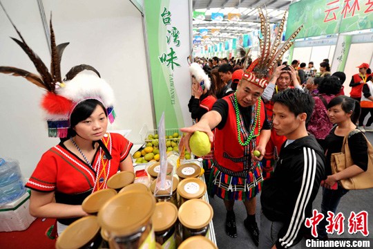 图为台湾少数民族在漳州举办的两岸花博会上盛装促销。中新社发 王东明 摄
