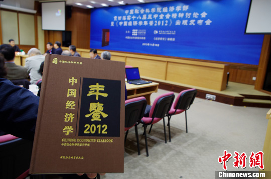 11月18日,大型专业学术年鉴——《中国经济学年鉴2012》在北京发布。该年鉴系统收集和反映了2012年度中国经济学和管理学界在学科发展、研究文献、热点著作、重要学术活动和著名学术机构等方面的主要动态和信息,由中国社会科学院经济学部组织编写。中新社发 贾天勇 摄