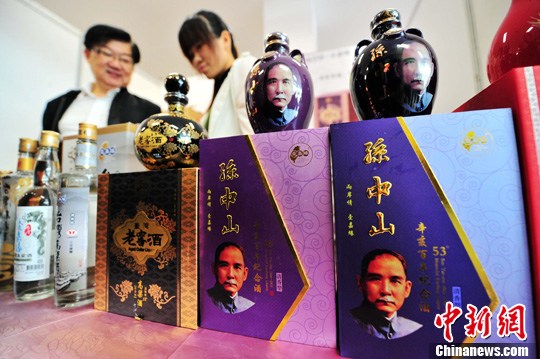 11月18日,由台湾企业生产的“孙中山”酒亮相首届平潭台湾商品交易会。当日,“2013平潭·台湾商品交易会”在平潭对台进出口农特产品市场举行,这是平潭首次举办台湾原产地商品展会。中新社发 张斌 摄