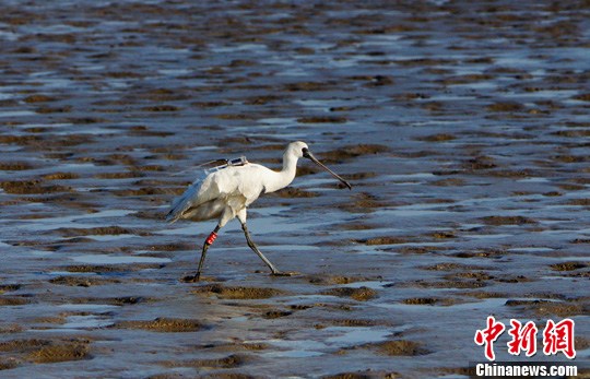 近日,佩戴着卫星跟踪器的黑脸琵鹭“华华”飞离辽宁庄河河口,在胶东半岛南端的苏山岛休整后,当早向南飞往江苏盐城东南方向,最高时速近每小时100公里。WWF(世界自然基金会)预计,黑脸琵鹭当晚将在射阳县停歇。图为背负着卫星跟踪器的黑脸琵鹭在庄河觅食。中新社发 周海翔