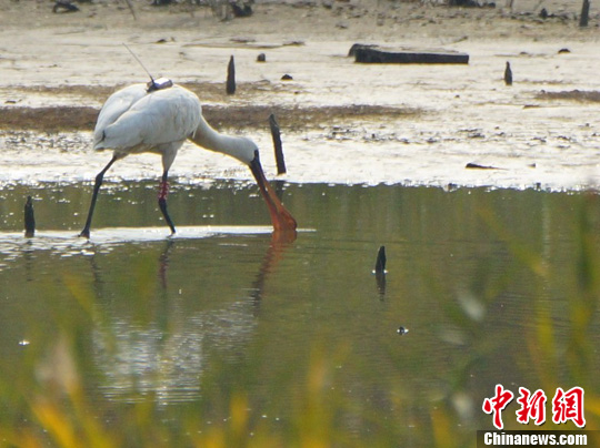 图为背负着卫星跟踪器的黑脸琵鹭在庄河觅食。中新社发 周海翔
