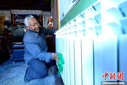 11月18日,65岁的拉萨市民洛桑多吉正在家中擦拭新安装的暖气片。自2012年拉萨市供暖工程启动以来,截止目前为止,已有一万多户居民家中完成了供暖系统入户安装。中新社发 李林 摄