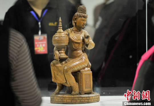 11月18日,参观者欣赏展出的缅甸雕刻作品。当日,“四海一家”——驻华使馆馆藏精品展在昆明开幕,以艺术博览的形式集中展示27个国家驻华使馆珍藏的文化艺术精品。中新社发 刘冉阳 摄