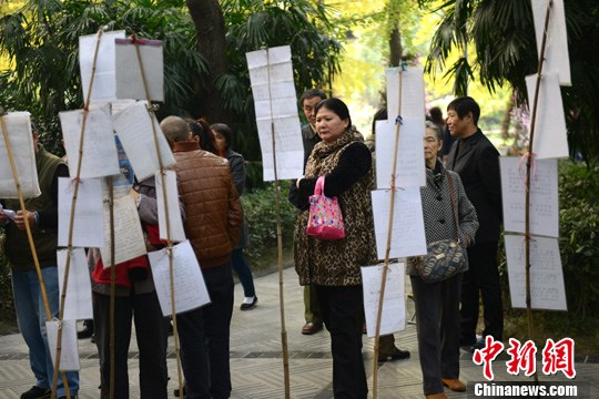 11月18日,成都人民公园里不足百米的小道上,挤满了上百人前来浏览、咨询婚姻登记,变身为“坝坝相亲场”。一些单身、未婚人士将自己的简历写于纸上,用木条简单地支撑在地上,成为了一条条征婚启示。图为民众在“坝坝相亲场”看征婚启示。中新社发 张浪 摄