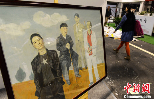 11月18日,名为《四大屌丝图》的绘画作品亮相长沙798红馆。冯小刚、黄永玉、孙杨、史玉柱这四位分别来自中国娱乐界、艺术界、体育界和商界的以“屌丝”形象出现在画面中,引起热议。中新社发 杨华峰 摄